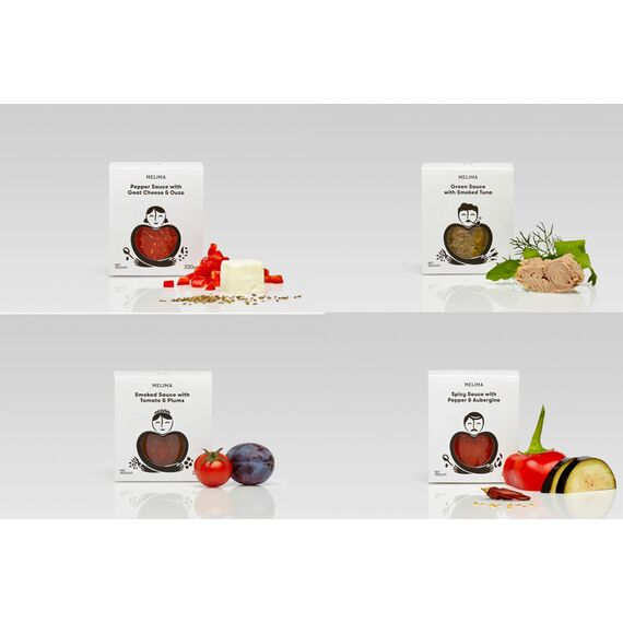 Σάλτσα Κόκκινης Πιπεριάς με Μυζήθρα και Ούζο 230gr & Πράσινη Σάλτσα με Καπνιστό Τόνο 220gr & Καπνιστή Σάλτσα με Τομάτα και Δαμάσκηνα 240gr & Σάλτσα Καυτερή Κόκκινης Πιπεριάς και Μελιτζάνας 230γρ